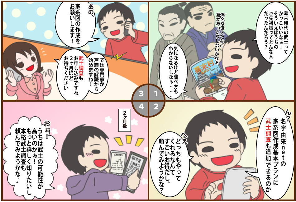 名字由来netでは初段階として「簡易武士調査」を10万円(税込11万円)で実施できます!その結果を鑑み、本格武士調査に進むことで判明する場合もございます。お気軽にご相談ください。