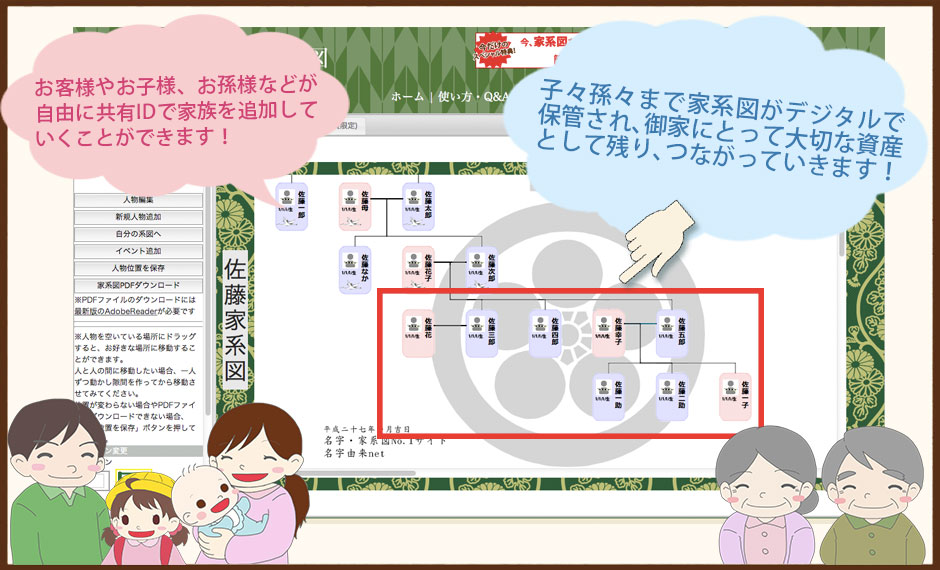 名字由来netの「家系図作成サービス」では「生涯データサポート」により、お子様やお孫様など新しい人物も自由に加えていくことができます。