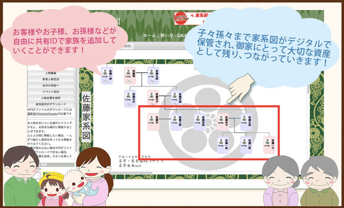 ご先祖様とあなたの家系図が、お子様やお孫様、子子孫孫にまで、半永久的に残っていきます。