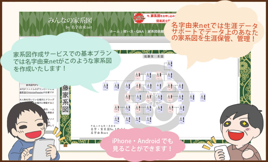 使いやすいWeb(みんなの家系図)やアプリ(家系図、みんなの家系図、ニッポンの家系図、赤ちゃん家系図)で簡単に、いつでも、どこでも、家系図をご覧いただけます!