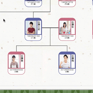 ・ご自分の家族の家系図が作成可能となる機能です。「遠縁お知らせ」機能がついているため複数のユーザー様が家系図を作成することで網の目のようにご先祖様同士や遠縁とつながることが可能になります。ご自分の由来やルーツを深くまで知ることができます。