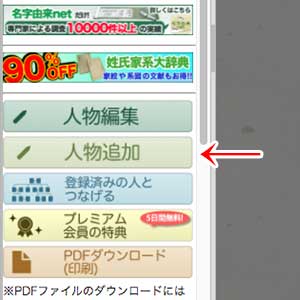 ・ご利用いただくにはこちらより無料会員登録もしくはプレミアム会員登録(5日間無料)を行なってください。会員登録が済みましたら、こちらより家系図作成画面へ移動できます。