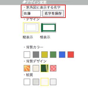 ・最初に登録した人の名字が自動で表示されるようになっておりますが、画面左側デザイン変更欄の「家系図に表示する名字」で変更ができます。