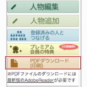 ・なお、プリンタの設定や用紙サイズによっては白紙のページが印刷されることもございます。お手数ですが、適宜印刷設定を調整してご利用ください。家系図PDFファイルの閲覧には、別途最新版のAdobe Reader®が必要です。古いバージョンをお使いの場合、アップデートをお願いします。