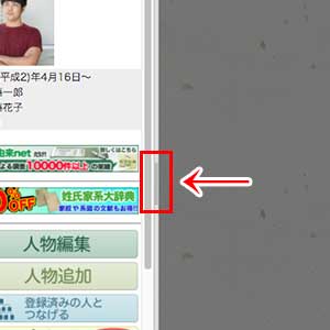 ・家系図の登録人数が多い場合、人物が一画面内に収まりきらない場合があります。画面右端「拡大/縮小バー」の隣にある、スクロールバーを下にドラッグしていただくことで、画面内に収まりきらなかった登録人物をご確認いただけます。