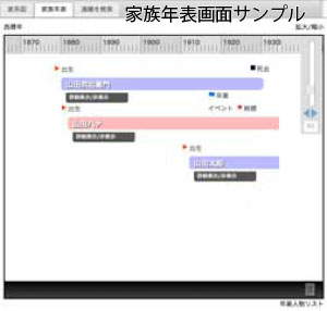 年表形式で家族やご先祖様を見やすく管理。また、日々のできごとを写真付きで登録することにより、お子さんやお孫さんの成長日記としてご利用いただくこともできます。