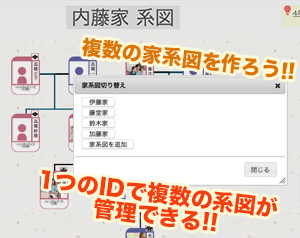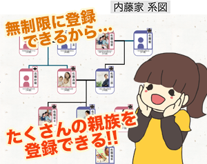 ご自分のご家族の家系図が無料で作成可能になり、「非公開」設定でご自分の家族のみで楽しむことや「情報公開」して複数のユーザー様と家系図で繋がって行くこともできます。