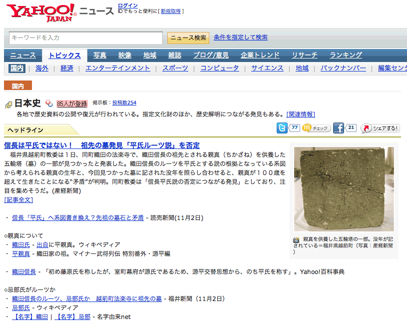 | 2011年11月 | Yahoo!ニュースに名字由来netが掲載されました